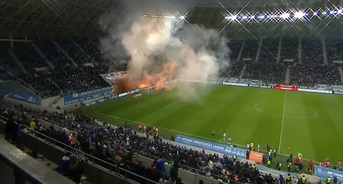Show pirotehnic în Bănie! Torțele au ajuns pe teren și au oprit derby-ul Universitatea Craiova – Dinamo | FOTO