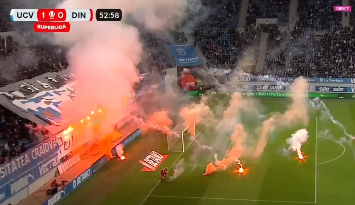 Show pirotehnic în Bănie! Torțele au ajuns pe teren și au oprit derby-ul Universitatea Craiova – Dinamo | FOTO