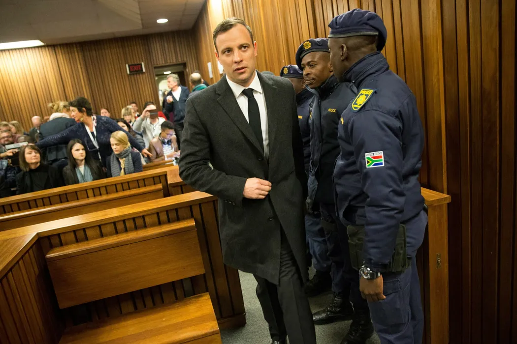 PRETORIA, SOUTH AFRICA - JULY 06: South African Paralympic athlete Oscar Pistorius arrives with security at the North Gauteng High Court to attend summary judgement on his trial on July 6, 2016 in Pretoria, South Africa.The Paralympic athlete killed his girlfriend on Valentine?s Day of 2013, when he fired a gun four times through a locked toilet door at his Pretoria home. Marco Longari / AFP / Pool / Anadolu Agency
