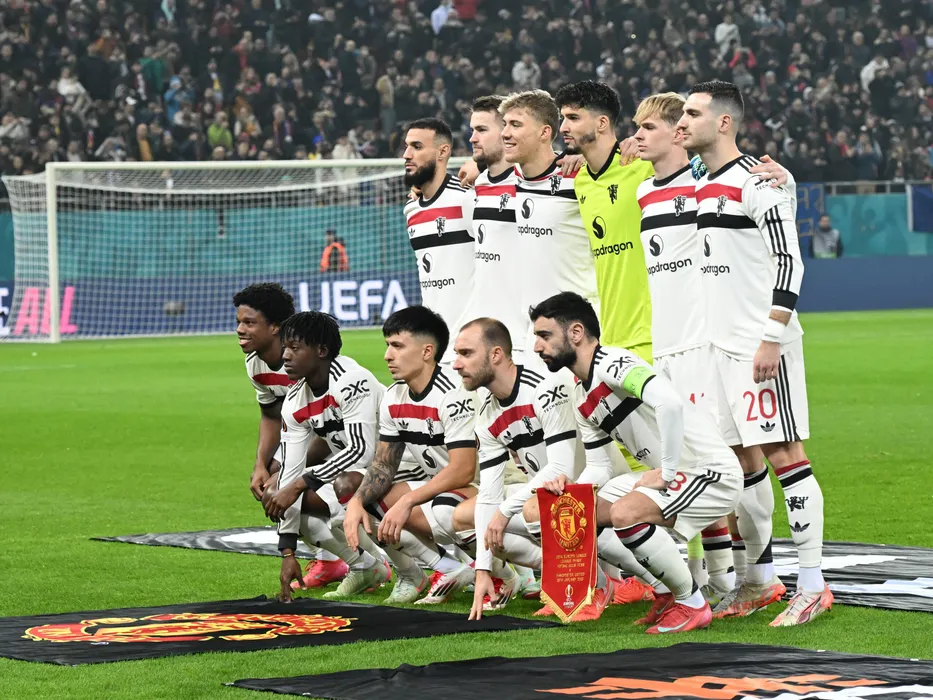Fotbaliștii englezi la o fotografie de grup realizată înaintea meciului de fotbal dintre FCSB si Manchester United, din cadrul UEFA Europa League, desfasurat pe Arena Nationala din Bucuresti, joi 30 ianuarie 2025. © FOTO:Razvan Pasarica/SPORT PICTURES