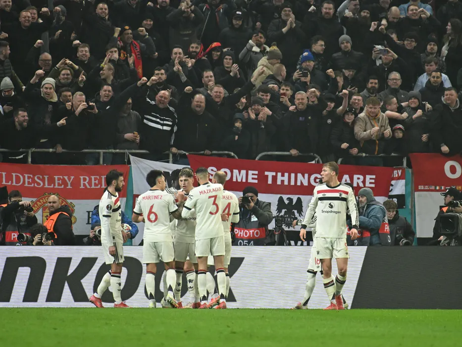 Fotbaliștii englezi printre care Bruno Fernandes, Alejandro Garnacho si Harry Maguire se bucură dupa un gol marcat alături de galerie la meciul de fotbal dintre FCSB si Manchester United, din cadrul UEFA Europa League, desfasurat pe Arena Nationala din Bucuresti, joi 30 ianuarie 2025. © FOTO:Razvan Pasarica/SPORT PICTURES