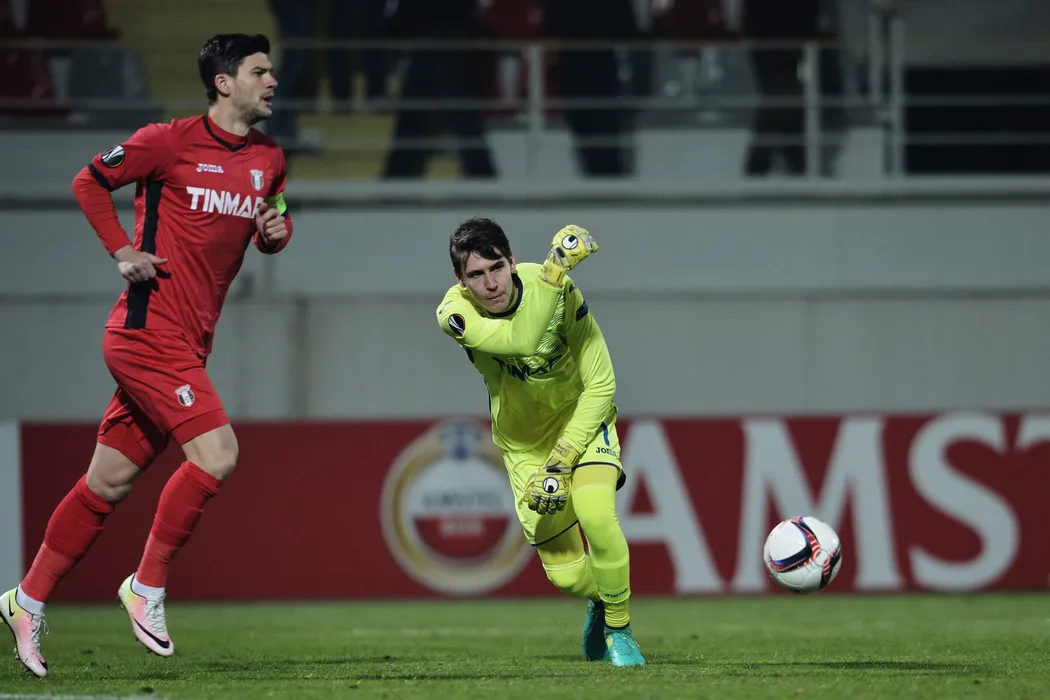 Portarul Silviu Lung (D), de la Astra Giurgiu, paseaza o minge in timpul meciului de fotbal contra echipei belgiene Genk, din saisprezecimile Europa Legue, disputat pe Stadionul Marin Anastasovici, din Giurgiu, joi, 16 februarie 2017. ALEXANDRU DOBRE / MEDIAFAX FOTO