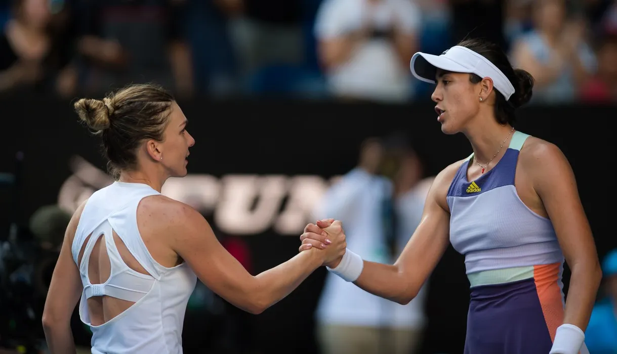 Simona Halep of Romania & Garbine Muguruza of Spain at the net after the semi-final of the 2020 Australian Open Grand Slam tennis tournament