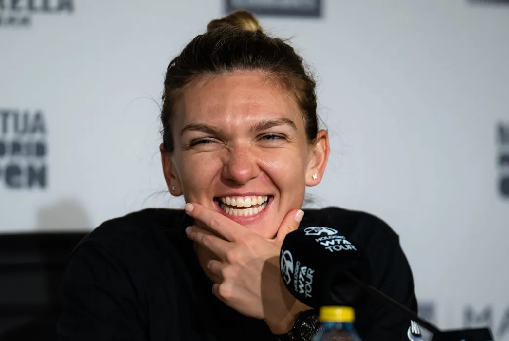 MADRID, SPAIN - APRIL 30: Simona Halep of Romania talks to the media after defeating Paula Badosa of Spain in her second round match on Day 3 of the Mutua Madrid Open at La Caja Magica on April 30, 2022 in Madrid, Spain (Photo by Robert Prange/Getty Images)