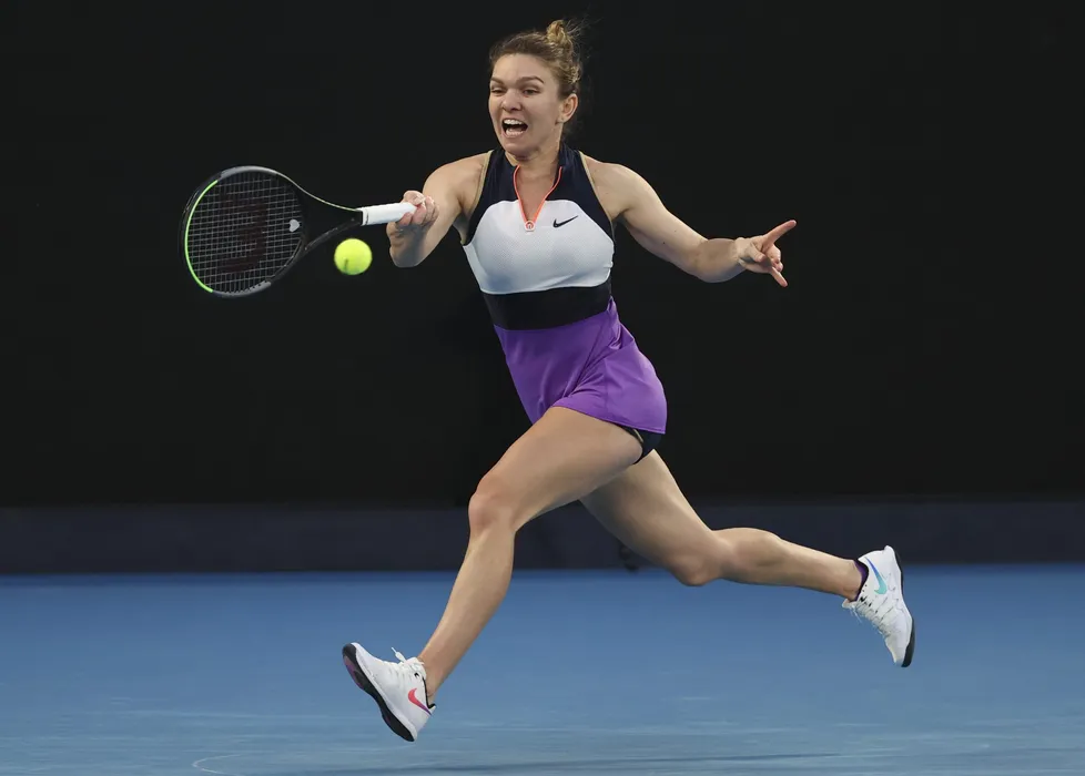 Romania's Simona Halep hits a forehand return to Poland's Iga Swiatek during their fourth round match at the Australian Open tennis championship in Melbourne, Australia, Sunday, Feb. 14, 2021.(AP Photo/Hamish Blair)