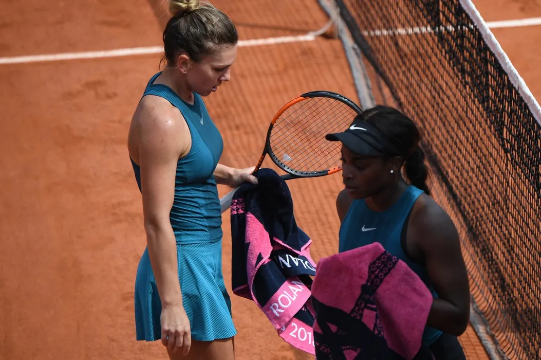 Sloane Stephens of the US (R) and Romania's Simona Halep change ends, during their women's singles final match on day fourteen of The Roland Garros 2018 French Open tennis tournament in Paris on June 9, 2018.,Image: 374551249, License: Rights-managed, Restrictions: , Model Release: no