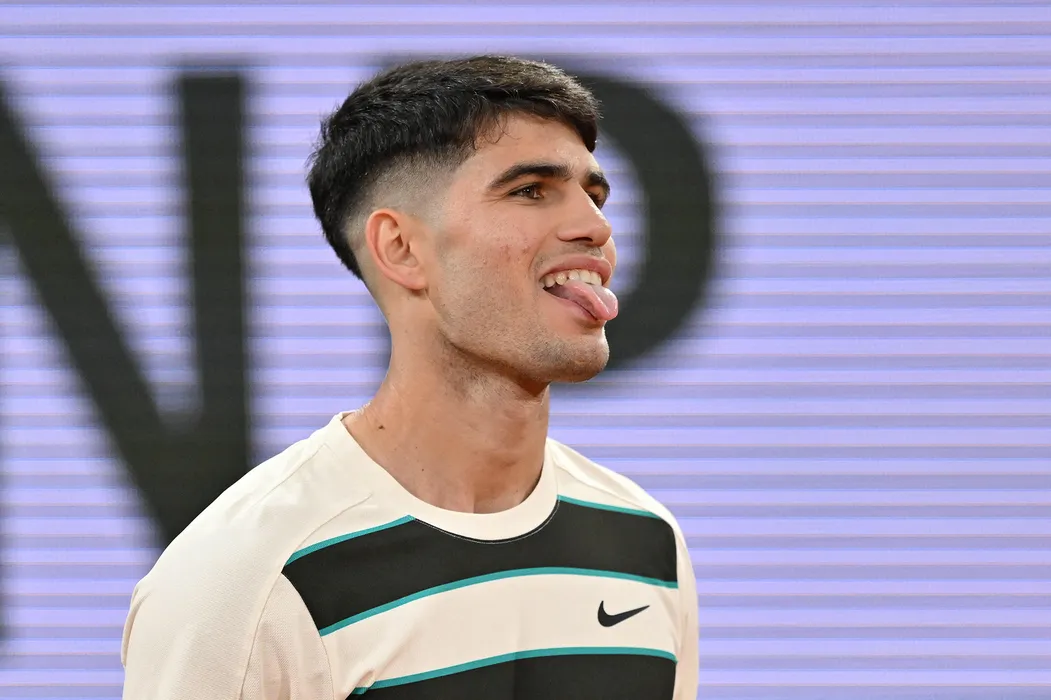 PARIS, FRANCE - MAY 28: Carlos Alcaraz of Spain in action against Fabian Marozsan (not seen) of Hungary during their Men's Singles tennis match on Day Four of the 2025 Roland-Garros at Philippe-Chatrier Court in Paris, France on May 28, 2025. Mustafa Yalcin / Anadolu/ABACAPRESS.COM