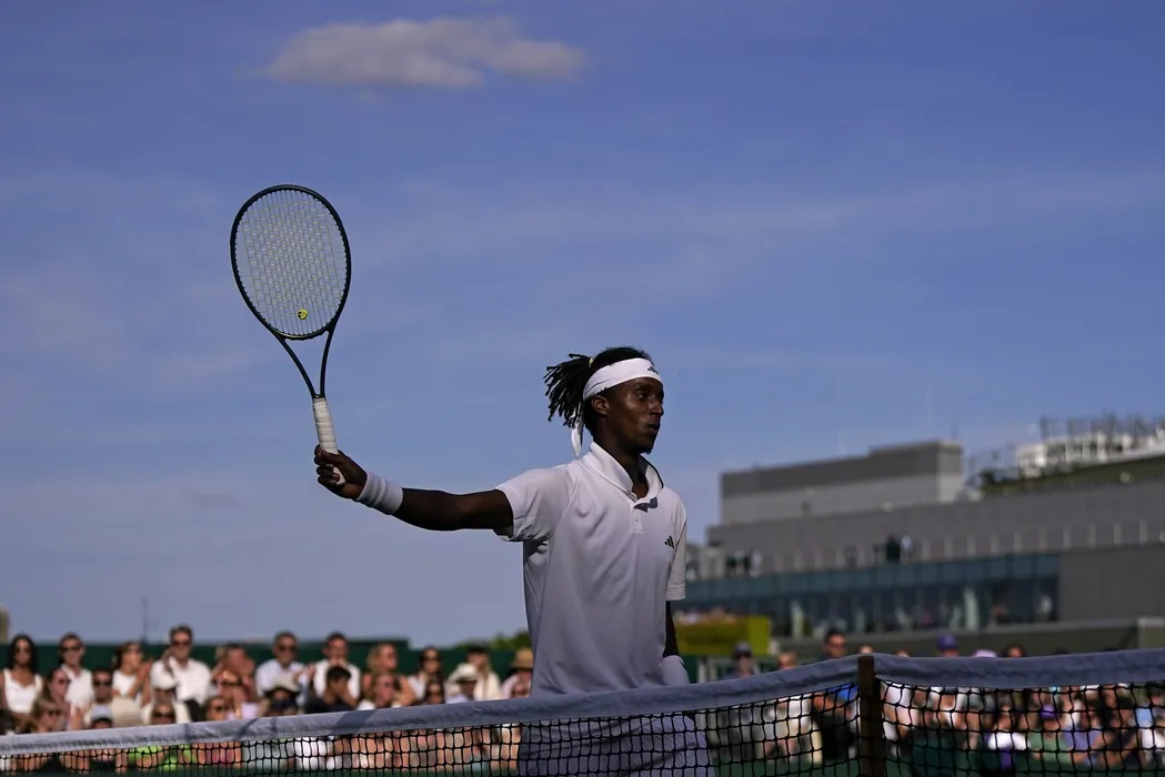 Sweden's Mikael Ymer waves his racquet as he plays Taylor Fritz of the US in a men's singles match on day four of the Wimbledon tennis championships in London, Thursday, July 6, 2023.,Image: 787593643, License: Rights-managed, Restrictions: This content is intended for editorial use only. For other uses, additional clearances may be required., Model Release: no, Pictured: Mikael Ymer,Taylor Fritz