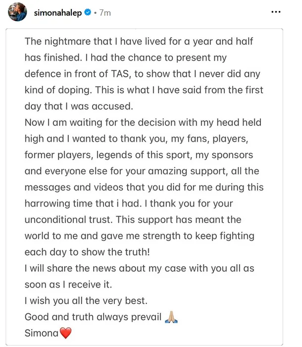 Simona Halep, anunț spectaculos despre verdictul TAS: „Coșmarul a luat sfârșit! Le-am demonstrat că nu m-am dopat sub nicio formă”