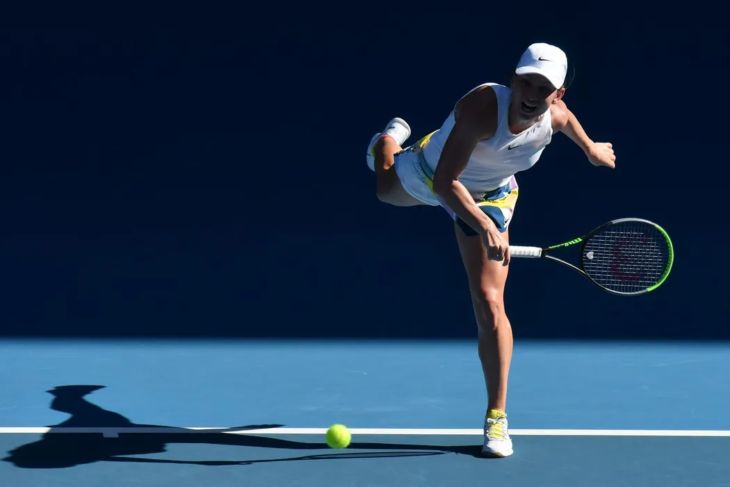 4th seed SIMONA HALEP (ROU) in action against GARBINĚE MUGURUZA (ESP) on Rod Laver Arena in a Women's Singles Semifinal match on day 11 of the Australian Open in Melbourne, Australia. MUGURUZA won 76 75