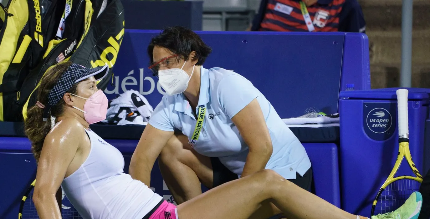 Danielle Collins, of the United States, gets medical attention during her match against Simona Halep, of Romania, during second round of play at the National Bank Open tennis tournament Wednesday August 11, 2021 in Montreal.
