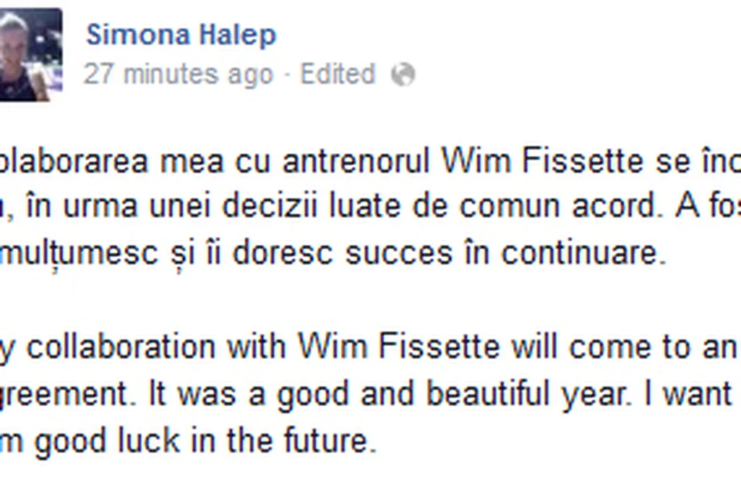 Simona Halep îi spune adio pe Facebook lui Wim Fissette. „A fost un an bun și frumos”. Ce îi dorește campioana din Constanța