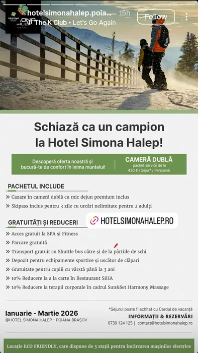 Simona Halep le face românilor o ofertă de nerefuzat la hotelul ei din Poiana Brașov. Cât costă acum două nopți de cazare cu acces gratuit la SPA şi skipass inclus