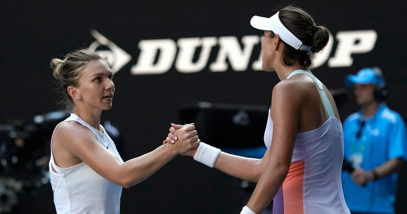 Spain's Garbine Muguruza, right, is congratulated by Romania's Simona Halep after winning their semifinal match at the Australian Open tennis championship in Melbourne, Australia, Thursday, Jan. 30, 2020.,Image: 572085417, License: Rights-managed, Restrictions: This content is intended for editorial use only. For other uses, additional clearances may be required., Model Release: no, Pictured: Garbine Muguruza,Lee Jin,Simona Halep