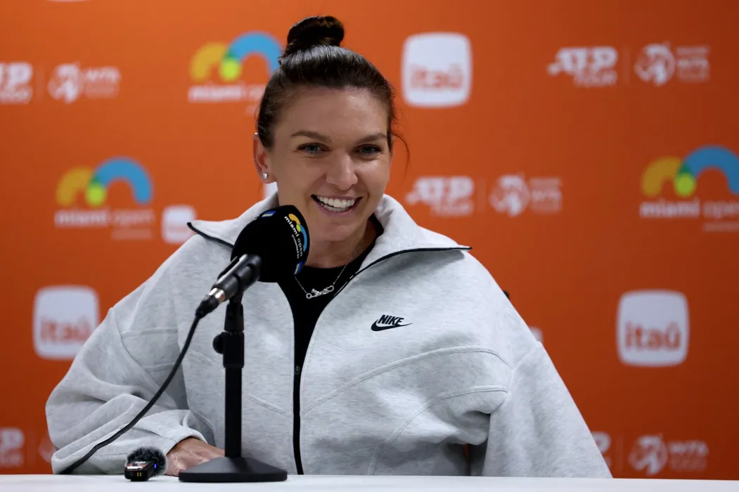 MIAMI GARDENS, FLORIDA - MARCH 19: Simona Halep of Romania speaks to the media after a 6-1, 4-6, 3-6 loss to Paula Bados at the Miami Open at Hard Rock Stadium on March 19, 2024 in Miami Gardens, Florida. The former world number one player was competing in her first tournament in 18 months after serving out a doping ban. Megan Briggs,Image: 858128392, License: Rights-managed, Restrictions: , Model Release: no