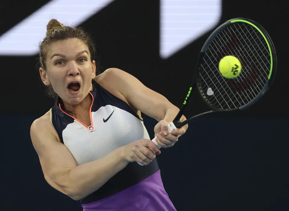 Romania's Simona Halep hits a backhand return to Poland's Iga Swiatek during their fourth round match at the Australian Open tennis championship in Melbourne, Australia, Sunday, Feb. 14, 2021.(AP Photo/Hamish Blair)