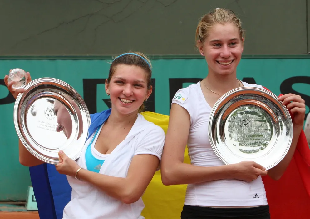 Romanian Simona Halep (L) and compatriot Elena Bogdan pose with their French tennis Open final match in the category junior at Roland Garros on June 08, 2008 in Paris. Halep won 6-4, 6-2.,Image: 25734833, License: Rights-managed, Restrictions: , Model Release: no