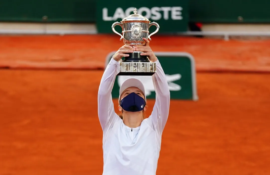 Iga Swiatek of Poland lifts the trophy after winning the Ladies Singles Final