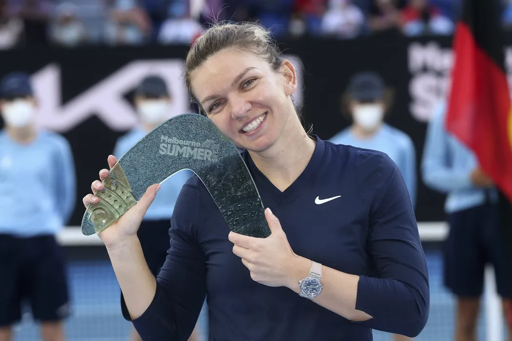 Simona Halep of Romania with the winner's trophy after her singles match against Veronika Kudermetova of Russia during the women's final of the Summer Set 1 tournament ahead of the Australian Open in Melbourne, Australia, Sunday, Jan. 9, 2022. (AP Photo/Hamish Blair)