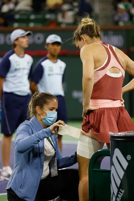March 18, 2022 Simona Halep of Romania has a trainer wrap her leg during her semifinal match against Iga Swiatek of Poland at the 2022 BNP Paribas Open at Indian Wells Tennis Garden in Indian Wells, California.,Image: 671785298, License: Rights-managed, Restrictions: , Model Release: no, Credit line: Profimedia