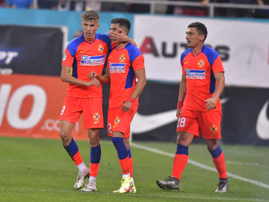 Bucurie a fotbalistilor stelisti dupa un gol marcat cu Octavian George Popescu, Claudiu Andrei Keseru si Valentin Gheorghe in meciul de fotbal dintre FCSB si Dinamo Bucuresti, contand pentru Liga 1 Casa Pariurilor, desfasurat pe Arena Nationala din Bucuresti, duminica 12 septembrie 2021. © FOTO:Razvan Pasarica/SPORT PICTURES