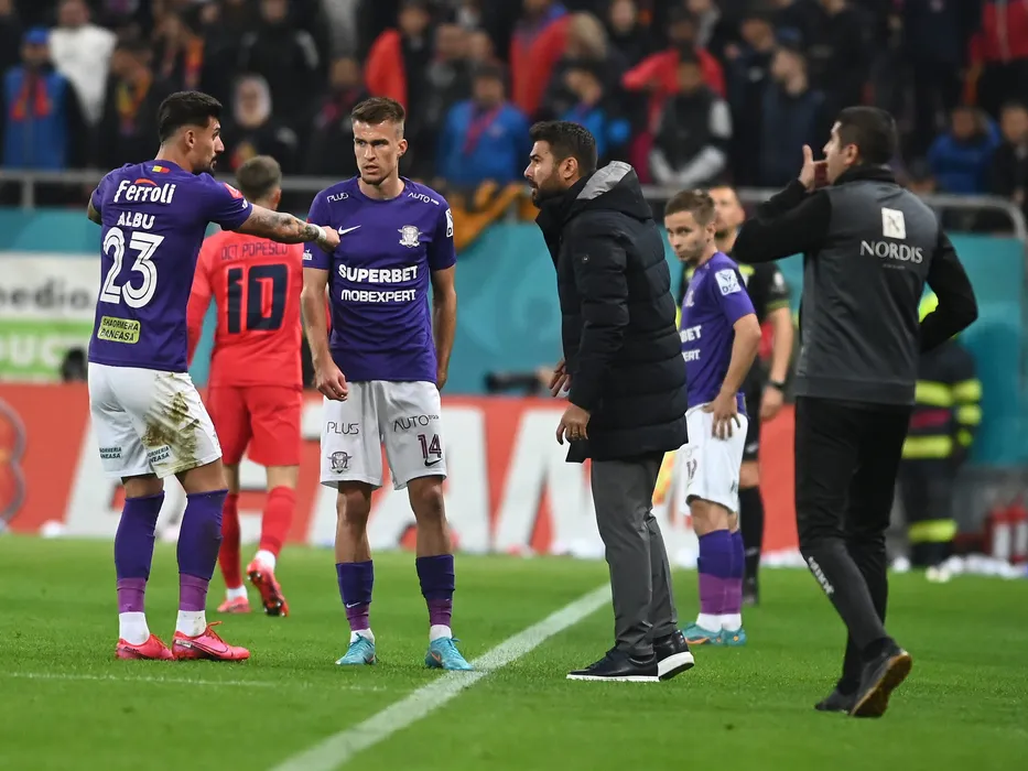 Adrian Mutu discuta cu Alexandru Cristian Albu si Mattias Kait in meciul de fotbal dintre FCSB si Rapid Bucuresti, contand pentru Superliga Superbet, desfasurat pe Arena Nationala din Bucuresti, duminica 6 noiembrie 2022. © FOTO:Razvan Pasarica/SPORT PICTURES