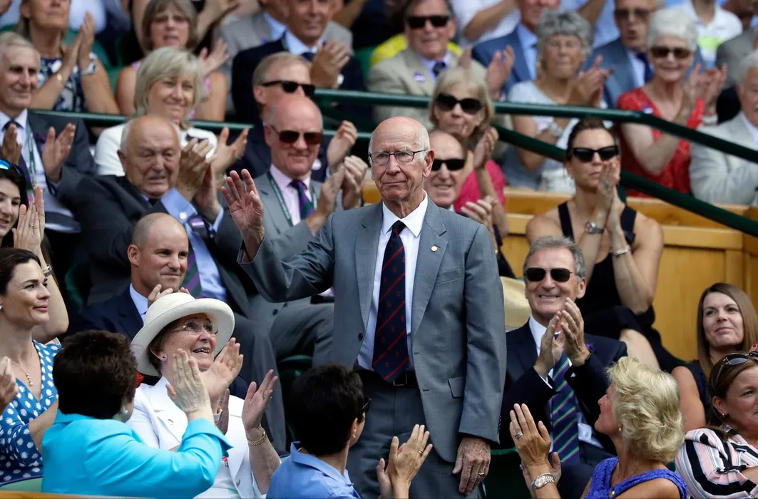 FILE - Former England soccer player Bobby Charlton stands in the Royal Box on Centre Court to receive applause from the crowd on the sixth day of the Wimbledon Tennis Championships in London, July 7, 2018. Bobby Charlton, an English soccer icon who survived a plane crash that decimated a Manchester United team destined for greatness to become the heartbeat of his country's 1966 World Cup-winning team, has died. He was 86. A statement from Charlton's family, released by United, said he died Saturday Oct. 21, 2023 surrounded by his family.,Image: 815561637, License: Rights-managed, Restrictions: This content is intended for editorial use only. For other uses, additional clearances may be required.