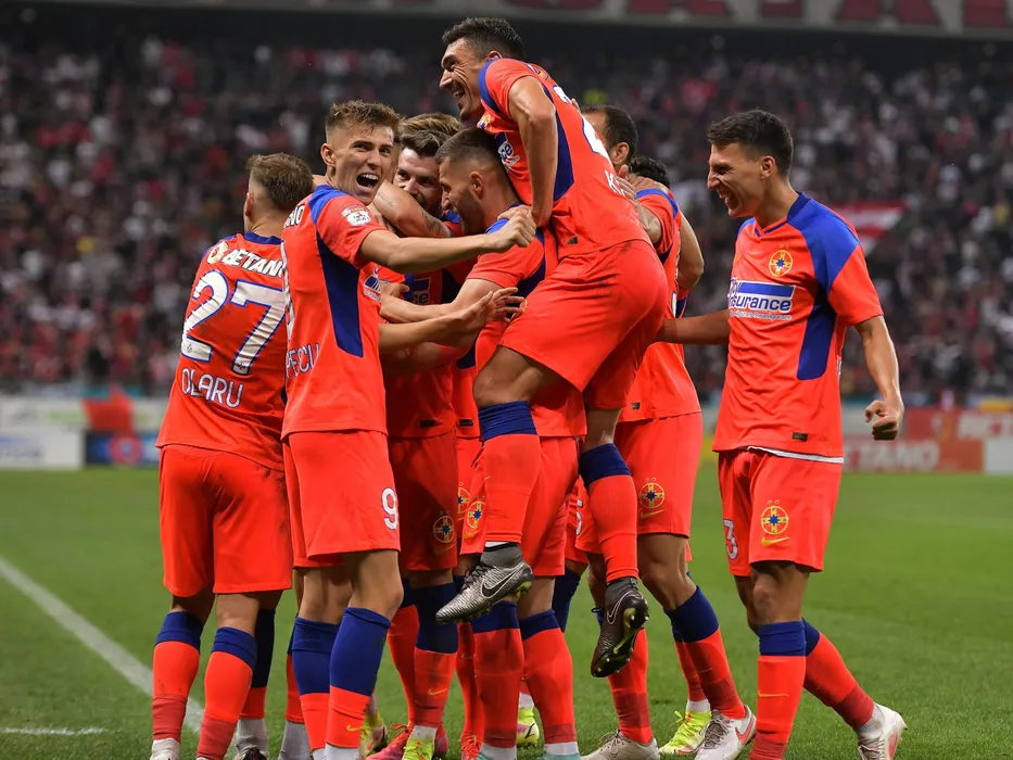 Bucurie a fotbalistilor stelisti dupa un gol marcat cu Octavian George Popescu, Claudiu Andrei Keseru si Risto Radunovic in meciul de fotbal dintre FCSB si Dinamo Bucuresti, contand pentru Liga 1 Casa Pariurilor, desfasurat pe Arena Nationala din Bucuresti, duminica 12 septembrie 2021. © FOTO:Razvan Pasarica/SPORT PICTURES