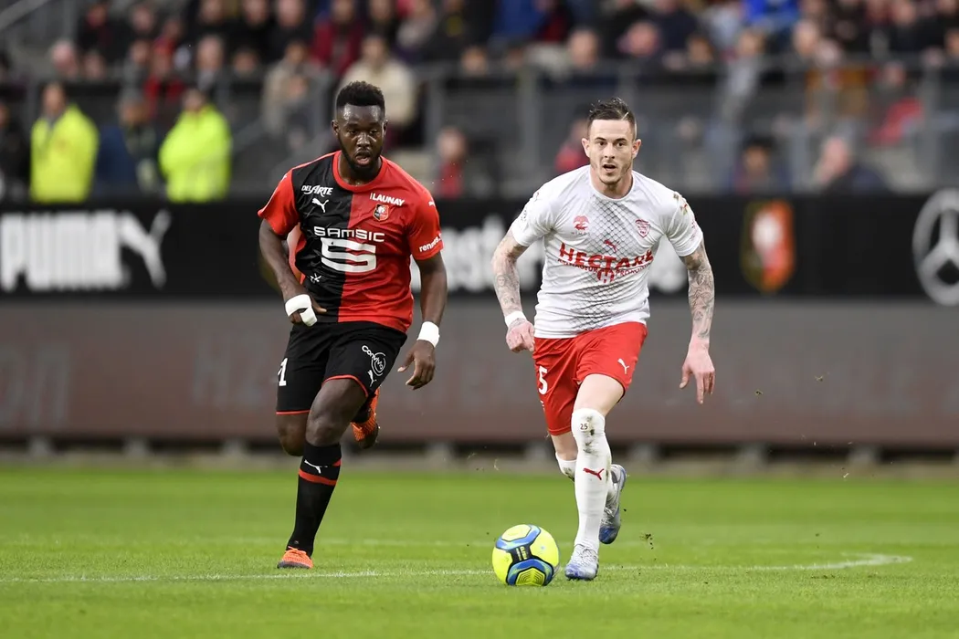 25 NOLAN ROUX (NIM) - 21 JORIS GNAGNON (REN) lors du match de Ligue 1 opposant le Stade rennais football club au Nîmes Olympique au stade Roazhon Park ŕ Rennes, France, le 23 février 2020. Rennes a gagné 2-1. © Anthony Bibard/Panoramic/Bestimage French L1 Football match between Stade Rennais Football Club and Nimes Olympique at the Roazhon Park, in Rennes, France, on February 23, 2020. Rennes won 2-1.,Image: 500597894, License: Rights-managed, Restrictions: , Model Release: no