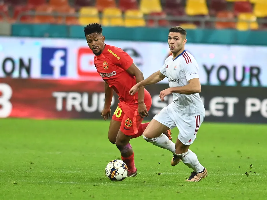 Siyabonga Ngezana si Samuel Teles Pereira Nunes Da Silva in meciul de fotbal dintre FCSB si Otelul Galati, din cadrul Superligii Superbet, desfasurat pe Arena Nationala din Bucuresti, duminica 3 decembrie 2023. © FOTO:Razvan Pasarica/SPORT PICTURES