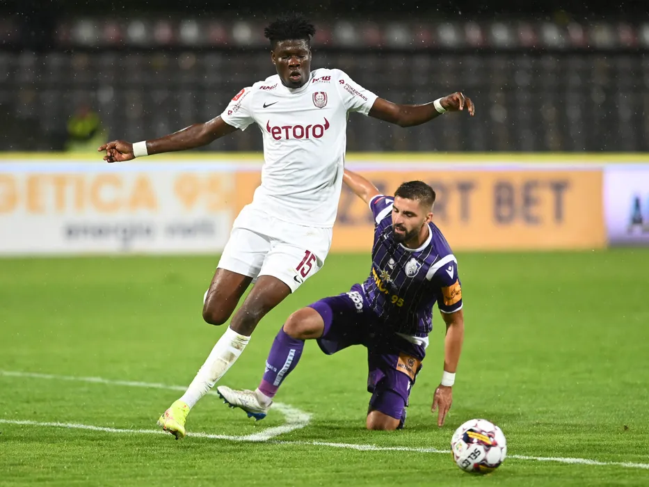 Emmanuel Yeboah si Alin Dobrosavlevici in meciul de fotbal dintre FC Arges si CFR Cluj, contand pentru Superliga Superbet, desfasurat pe Stadionul Nicolae Dobrin din Pitesti, luni 19 septembrie 2022. © FOTO:Razvan Pasarica/SPORT PICTURES