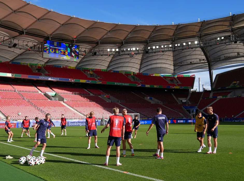 STUTTGART, GERMANY - JUNE 15: Players of Danish national football team attend the last training session before the EURO 2024 match against Slovenia at Stuttgart Arena in Stuttgart, Germany on June 15, 2024. Mahmut Serdar Alakus / Anadolu/ABACAPRESS.COM,Image: 881928248, License: Rights-managed, Restrictions: , Model Release: no