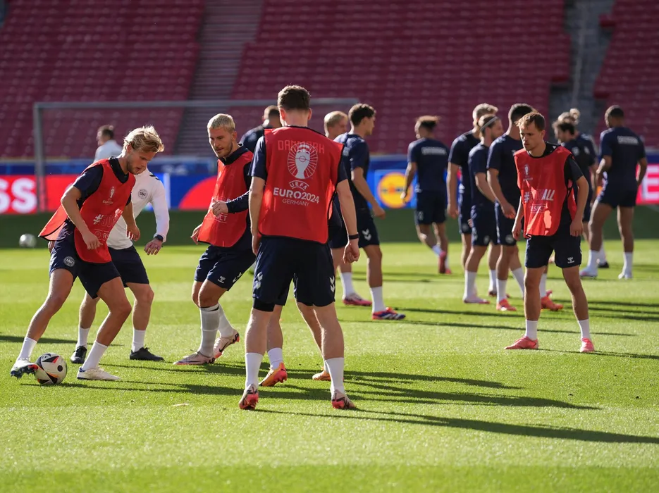 STUTTGART, GERMANY - JUNE 15: Players of Danish national football team attend the last training session before the EURO 2024 match against Slovenia at Stuttgart Arena in Stuttgart, Germany on June 15, 2024. Mahmut Serdar Alakus / Anadolu/ABACAPRESS.COM,Image: 881928243, License: Rights-managed, Restrictions: , Model Release: no