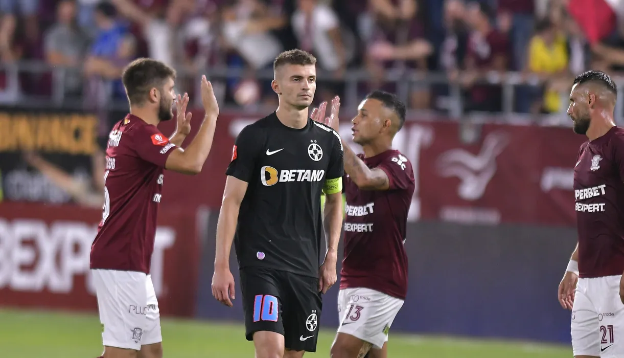 Florin Lucian Tanase suparat alaturi de fotbalistii rapidisti Paul Alexandru Iacob, Morais Junior Iraneuton Sousa si Dragos Grigore dupa meciul de fotbal dintre Rapid Bucuresti si FCSB, contand pentru Superliga Superbet, desfasurat pe Stadionul Rapid Giulesti din Bucuresti, duminica 24 iulie 2022. © FOTO:Razvan Pasarica/SPORT PICTURES