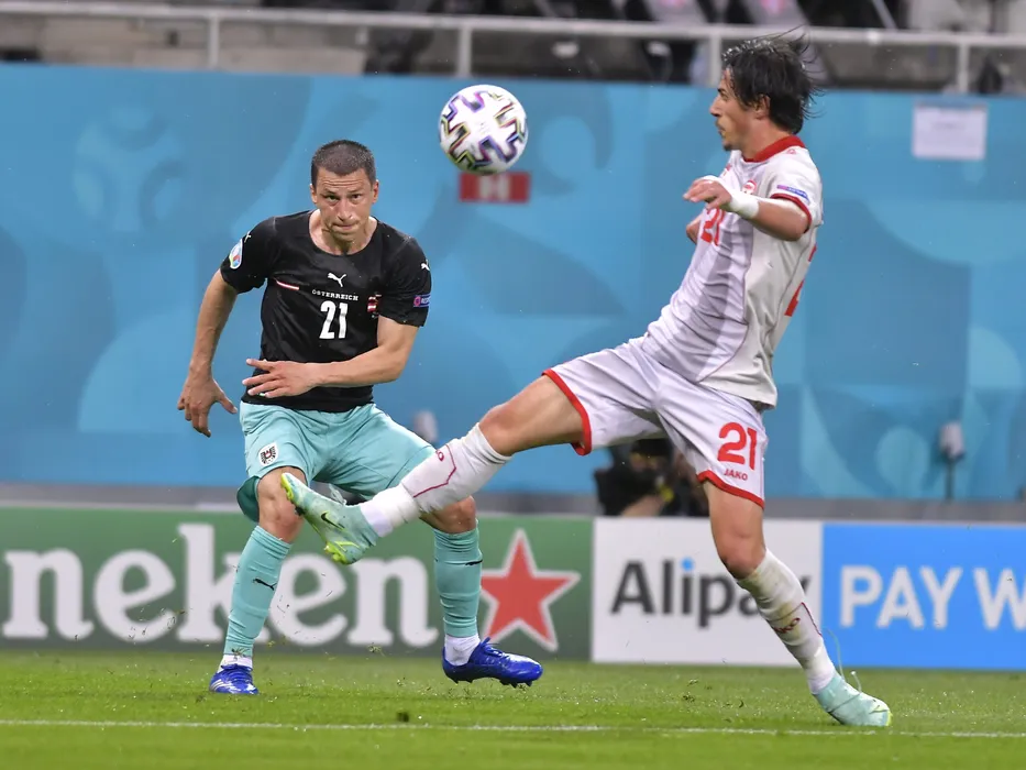 Stefan Lainer si Eljif Elmas in meciul de fotbal dintre Austria si Macedonia de Nord, din cadrul EURO 2020, desfasurat pe Arena Nationala din Bucuresti, duminica 13 iunie 2021. © FOTO:Razvan Pasarica/SPORT PICTURES