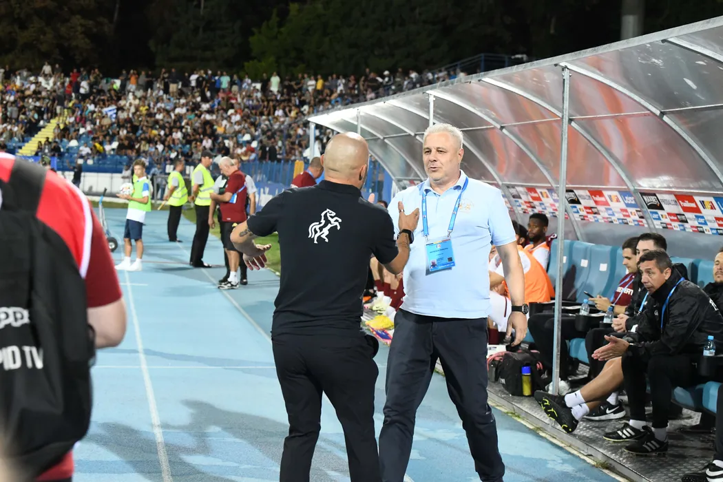 Cei doi antrenori Tony Da Silva și Marius Șumudică se salută înaintea meciului de fotbal dintre Poli Iași si FC Rapid 1923 București, contând pentru SuperLiga Superbet, desfășurat pe Stadionul Emil Alexandrescu din Iași, vineri 23 august 2024. © FOTO: Tudi/SPORT PICTURES