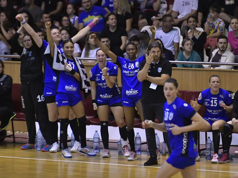 Bucurie a bancii bucurestene dupa un gol reusit cu Elizabeth Omoregie, Malin Larsen Aune, Siraba Dembele Pavlovic si Andrea Klikovac alaturi de Adrian Vasile in meciul de handbal feminin dintre CSM Bucuresti si Minaur Baia Mare, contand pentru Liga Florilor, desfasurat in Sala Rapid din Bucuresti, duminica 29 mai 2022. © FOTO:Razvan Pasarica/SPORT PICTURES