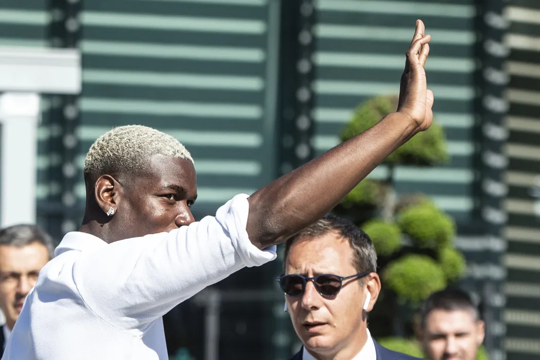 Midfielder Paul Pogba waves to fans as he arrives at Juve's Medical Center, in Turin, northern Italy, Saturday, July 9, 2022. More than 1,000 fans welcomed Paul Pogba back home as he returned to Juventus on a free transfer from Manchester United on Saturday. (LaPresse via AP)
