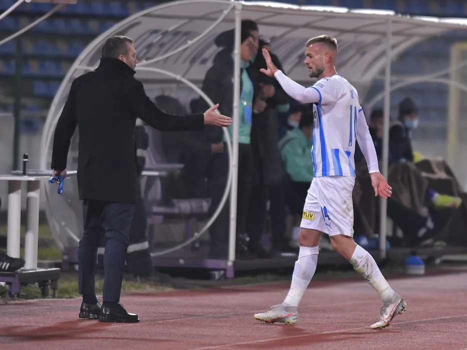 Lucian Pretorian il consoleaza pe Alexandru Cretu dupa eliminarea din joc la meciul de fotbal dintre FC Arges si Universitatea Craiova, contand pentru Liga 1 Casa Pariurilor, desfasurat pe Stadionul Nicolae Dobrin din Pitesti, duminica 21 noiembrie 2021. © FOTO:Razvan Pasarica/SPORT PICTURES