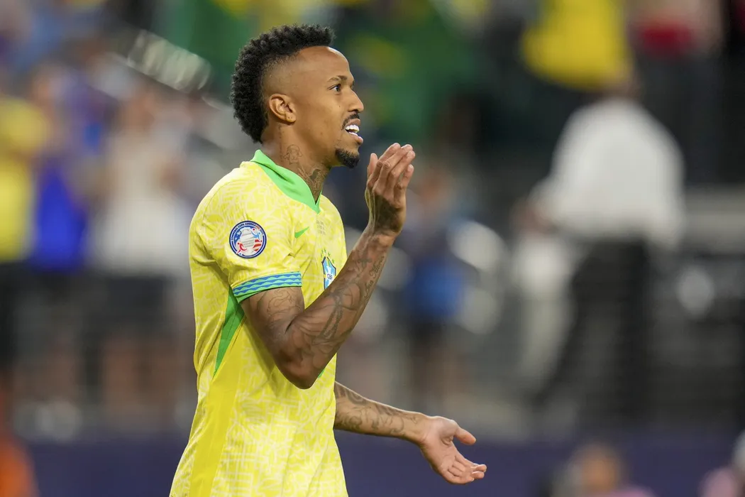 Brazil's Eder Militao gestures after missing his shot during a penalty shootout against Uruguay in a Copa America quarterfinal soccer match in Las Vegas, Saturday, July 6, 2024.,Image: 887909893, License: Rights-managed, Restrictions: This content is intended for editorial use only. For other uses, additional clearances may be required., Model Release: no