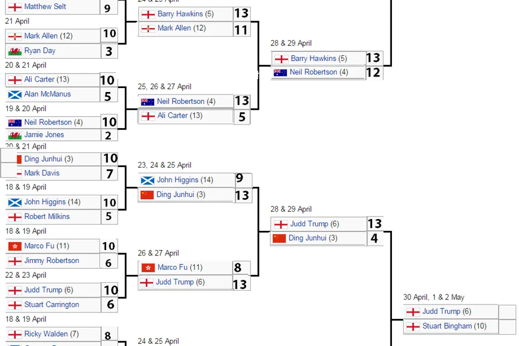 Șoc la Crucible: O’Sullivan, învins incredibil de Bingham. Robertson părăsește și el turneul, după ce pierde în joc decisiv în fața lui Hawkins. Programul semifinalelor