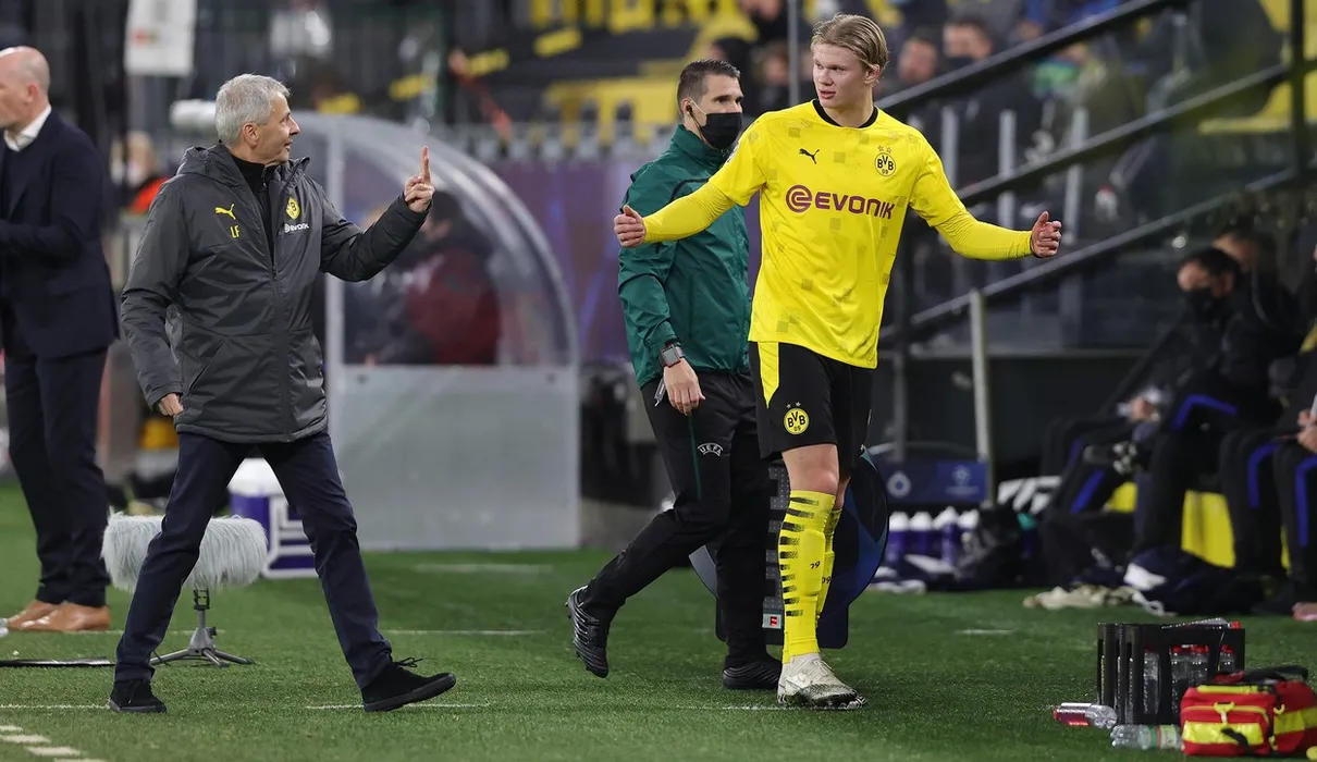 firo: 24.11.2020 Fuvuball, UEFA Champions League, CL, CHL, season 2020/2021, group F, BVB, Borussia Dortmund - Club Brvºgge GESTURING EXCHANGE Erling Haaland by coach Lucien Favre, GEstik, wit, humor | usage worldwide,Image: 571013519, License: Rights-managed, Restrictions: GERMANY OUT, Model Release: no