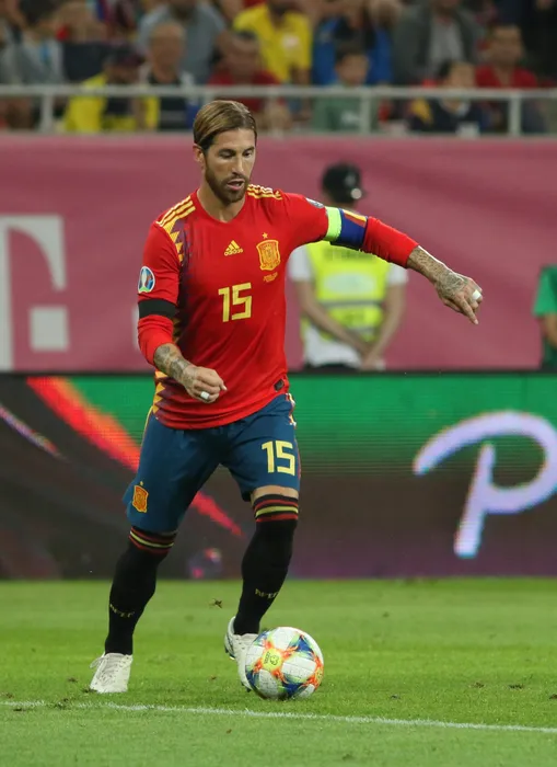 Sergio Ramos, de la nationala Spaniei, suteaza in timpul meciului de fotbal contra selectionatei Romaniei din Grupa F a preliminariilor Euro 2020, disputat pe Arena Nationala din Bucuresti, joi, 5 septembrie 2019 GEORGE FILIP / MEDIAFAX FOTO