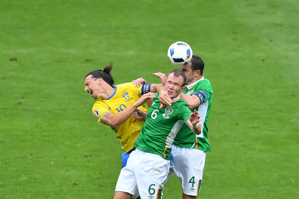 Glen Whelan (C), de la selectionata Irlandei, lupta pentru balon cu Zlatan Ibrahimovic (S), de la nationala Suediei, in timpul meciului de fotbal din Grupa E a Campionatului European de Fotbal, disputat pe stadionul Stade de France din Paris, luni 13 iunie 2016. ALEXANDRU DOBRE / MEDIAFAX FOTO sustinut de CARREFOUR