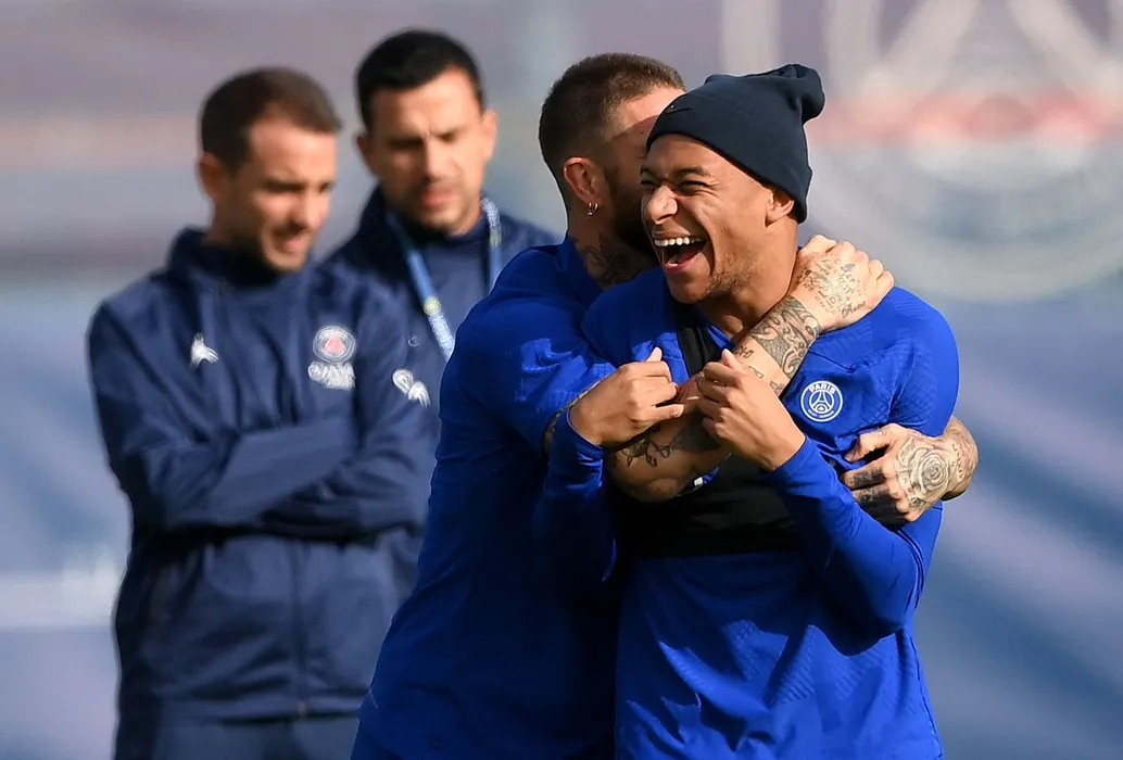 Paris Saint-Germain's Spanish defender Sergio Ramos (L) jokes with Paris Saint-Germain's French forward Kylian Mbappe during a training session at the club's Camp des Loges training ground in Saint-Germain-en-Laye, near Paris on October 10, 2022, on the eve of their UEFA Champions League first round Group H football match against Benfica.,Image: 729496493, License: Rights-managed, Restrictions: , Model Release: no