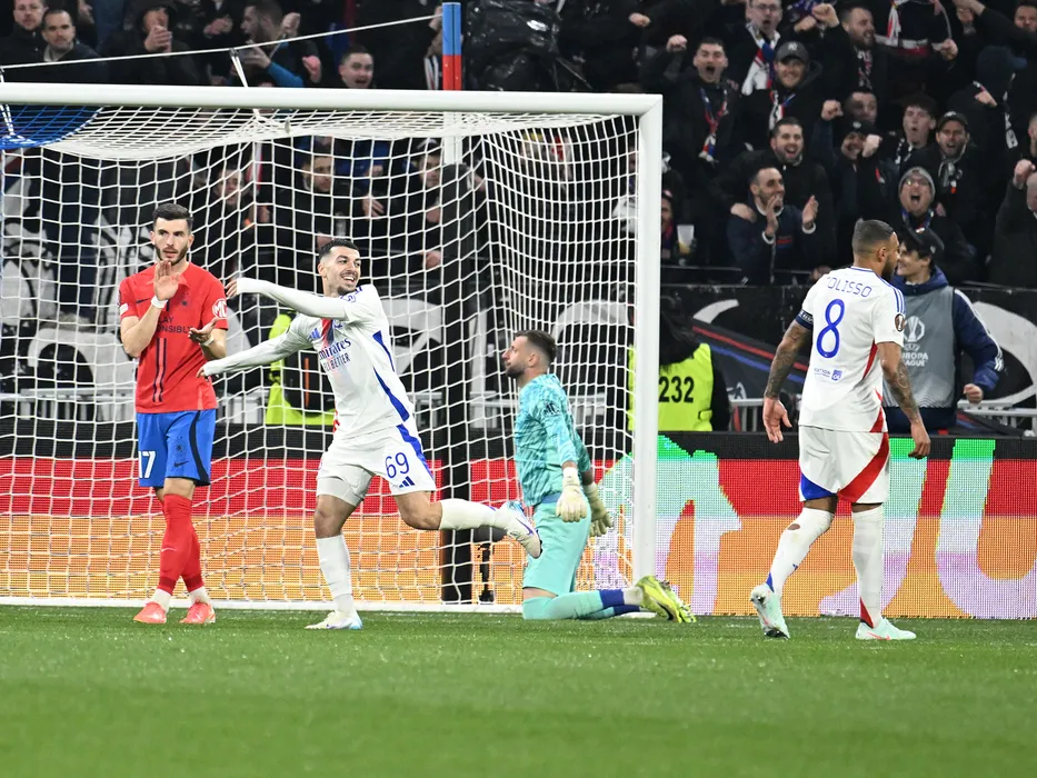 Georges Mikautadze se bucură dupa un gol marcat in poarta lui Lukas Zima spre dezamăgirea lui Mihai Popescu in meciul de fotbal dintre Olympique Lyon si FCSB din cadrul UEFA Europa League, desfasurat pe Groupama Arena din Lyon, joi 13 martie 2025. © FOTO:Razvan Pasarica/SPORT PICTURES