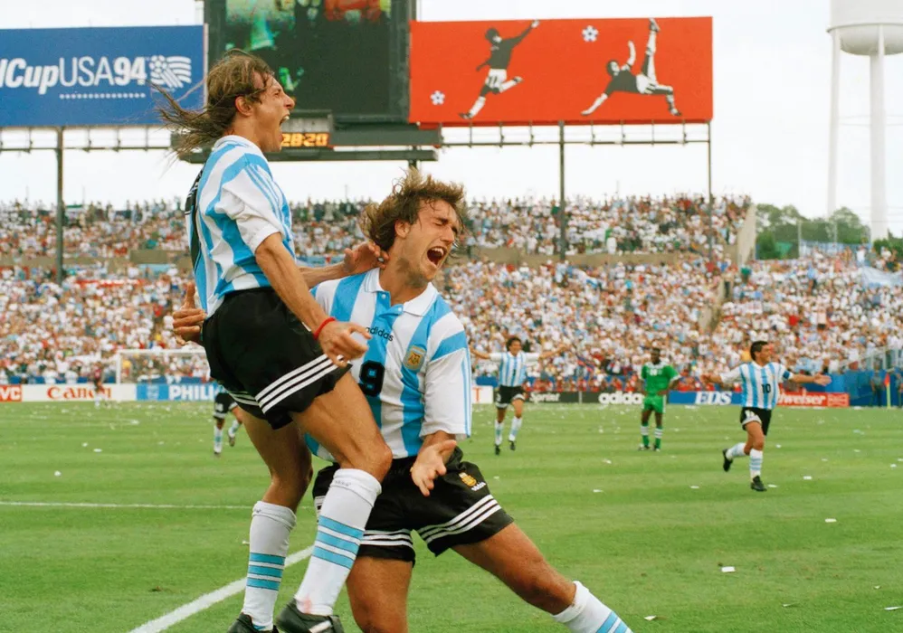 Argentina soccer players Claudio Caniggia, left, and Gabriel Batistuta celebrates the first of Caniggia’s two first half goals during their Group D World Cup soccer match against Nigeria on Saturday, June 25, 1994 at Foxboro Stadium in Foxboro, Mass.,Image: 599630960, License: Rights-managed, Restrictions: This content is intended for editorial use only. For other uses, additional clearances may be required., Model Release: no, Pictured: Claudio Caniggia; Gabriel Babtistuta