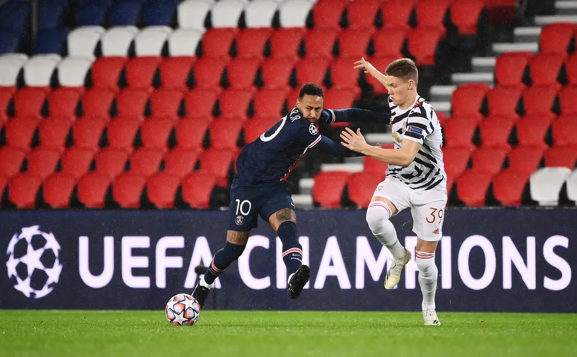 Paris Saint-Germain's Brazilian forward Neymar (L) vies for the ball with Manchester United's Scottish midfielder Scott McTominay during the UEFA Europa League Group H first-leg football match between Paris Saint-Germain (PSG) and Manchester United at the Parc des Princes stadium in Paris on October 20, 2020.,Image: 564698462, License: Rights-managed, Restrictions: , Model Release: no