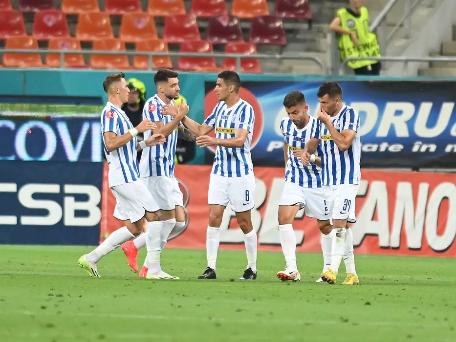 Bucurie a fotbalistilor ieseni Nicolas Samayoa,Gabriel Cristian Vasvari, Robert Andrei Ion si Mihai Catalin Bordeianu dupa un gol marcat in meciul de fotbal dintre FCSB si Politehnica Iasi, din cadrul Superligii Superbet, desfasurat pe Arena Nationala din Bucuresti, duminica 20 august 2023. © FOTO:Razvan Pasarica/SPORT PICTURES