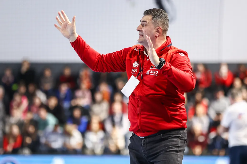 Constantin-Florentin Pera reacționând în meciul de handbal dintre România și Croația, contând pentru calificarea la EHF EURO 2024, desfășurat in Sala Sporturilor Teraplast Arena din Bistrița, miercuri 28 februarie 2024. © FOTO: Sorin PANĂ/SPORT PICTURES